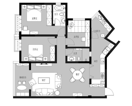 整个房屋通道呈L型,能更加便捷地进入各功能区。客餐厅连通设计符合当代人的个性需求,有休闲阳台和生活阳台,实用休闲两不误。