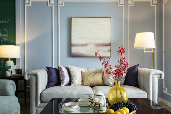 客厅浅天蓝的墙色中带有花纹石膏勾边线条,如果冻般柔软沁凉,配上屋顶蓝紫色的边饰线空间立体感十足,高雅和贵气油然而生。