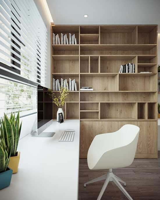用书原木将两个写字台分割开来,满足业主工作模式互不干扰的需求。