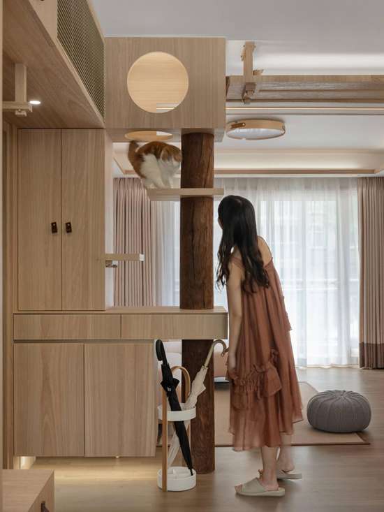 玄关的设计非常简单,能满足业主日常需求就行,和猫爬架相连,以一根原木柱契合在一起,颇有设计感。