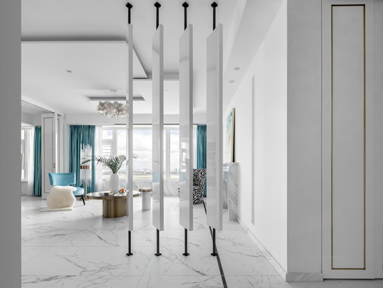 伫立于空间的四个立形石柱兼具现代屏风的美感和效果,巧妙地、有意无意地将玄关与客厅做了一定程度的隔断,既保证了采光,又进行了空间区分。