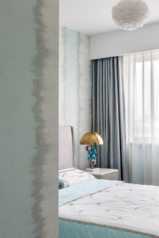 次卧的设计老道自如,亮灰的窗帘稳住了场面,在静谧的空间里,清蓝的软装流露出笃定的雅意,床头金属台灯轻奢而节制,配合的相得益彰。无论是哪一位客人住在这里,都能有到家的归属感。