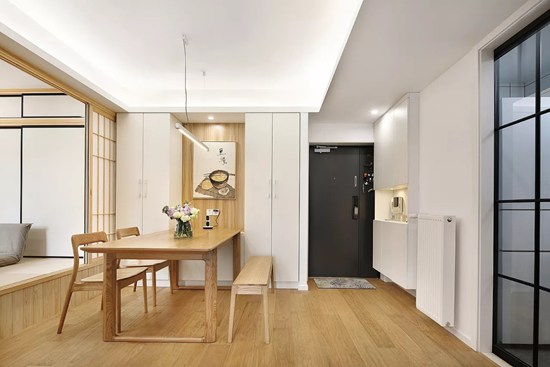 墙体式的收纳书柜把客厅与餐厅隔开,书柜和餐厅加上背后的榻榻米设计,也可为整个家的亮点设计,使屋主用餐、阅读、会客、休闲兼得。
