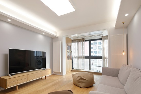 整个空间配色为温馨的原木色,浅灰色墙面和白色为主,营造出返朴归真的生活质感,不乏味,不混搭,平淡质朴。