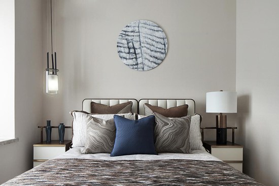 设计以浅灰色、白色、米色、木棕色等现代简约色系为主,不同的空间伴有明度与冷暖的调和,同色系中亦用饱和度的变化来突出层次感。象征中式的水墨画和灯具造型于通体的硬朗气质中做点睛,既体现了主次关系,也赋予一种东方意蕴的奢华:由表至里,含而不露。
