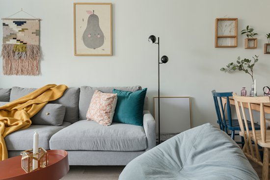 沙发不仅面料耐脏柔软,点缀上复古墨绿色与橘色花纹的抱枕,更显几分独特的气质。