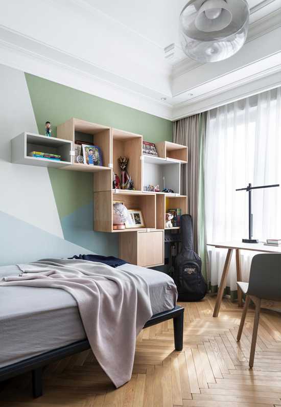 个性化的悬空衣柜设计,颜色淡雅清爽,大大增加收纳空间,美观实用。