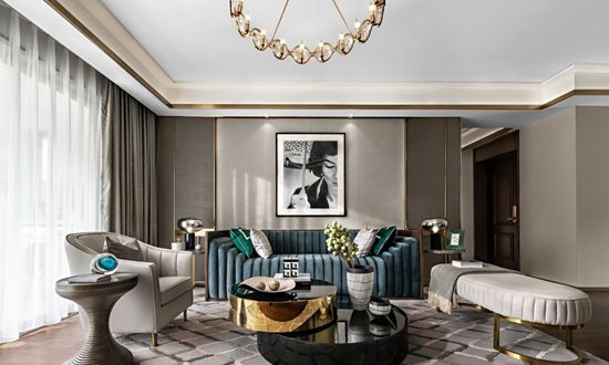 通过软硬装载入矜贵的湖蓝色和铜色,附着于绒面材质、金属材料之上,刚柔相融,在瑰丽的吊灯和无主灯映射下,绽放生活美学的品质之花。