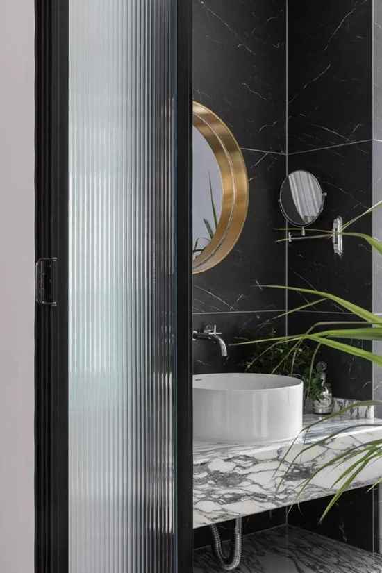 卫生间以黑色、白色为主基调,经典又前卫。而洗漱、沐浴和马桶各自合理分列,和谐为一体。