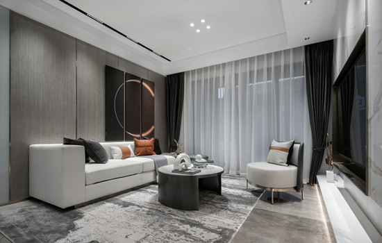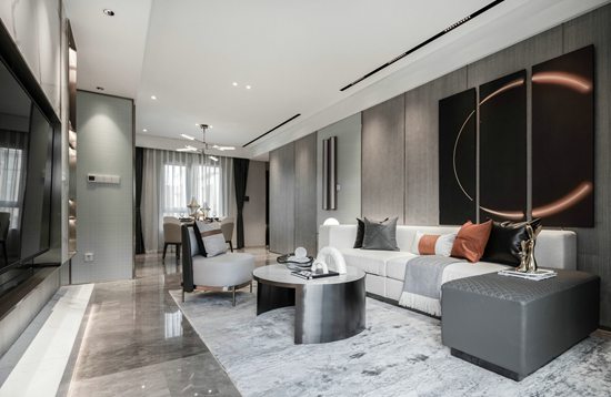 客厅以中性色调为主,洁白素雅的顶部用流畅简单的线条勾勒,地板用浅灰色亮面仿石面料通铺,整体看起来既简洁又奢华。