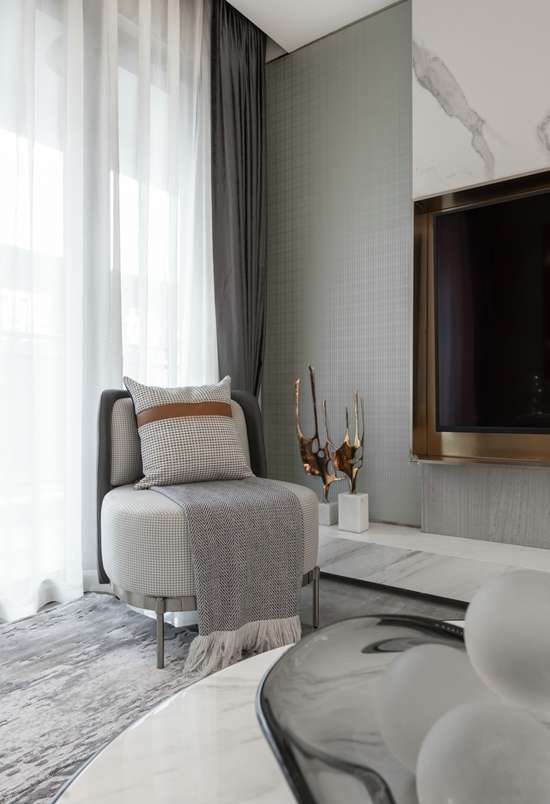 通铺的仿石瓷砖,延续了客厅的简约奢华,将室内整体显得更加和谐为一体。
