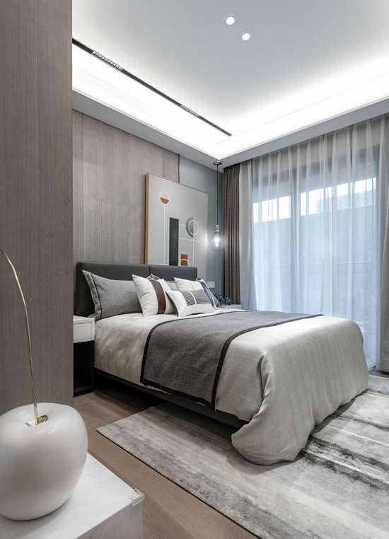 卧室遵循一贯的高级灰色调:简约的布艺大床、柔软的棉质床品、大面积的绒面地毯以及温馨舒适的飘窗,点点滴滴塑造了这个静谧又充满安全感的空间。