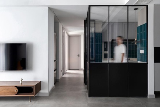 厨房的进门方向调整到面向走廊,采用“半墙主义”的设计,往上到顶全采用透明式的玻璃隔墙,加强了厨房与周围空间的联系,同时减少厨房空间因狭小带来的压抑感。