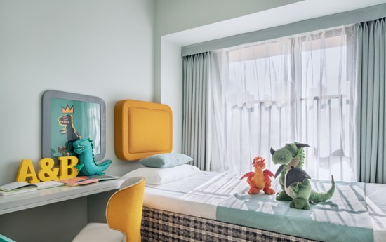 儿童房的设计相对随性自然一些,活跃的色彩,造型各异的恐龙玩偶,充满了童趣,阳光透过纱帘大片洒入,仿佛静止了岁月,定格在那纯真的孩提时代。