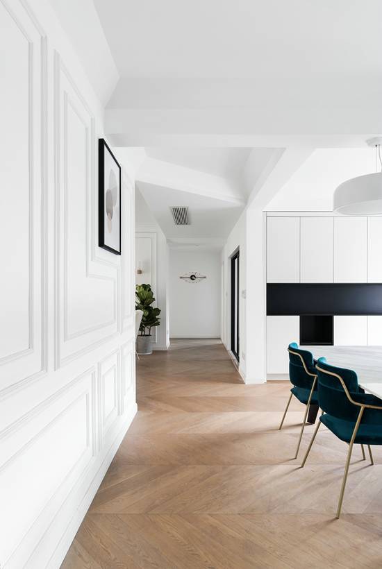 进入门厅,映入眼帘的是大面积欧式的爵士白护墙板,奢华大气。
