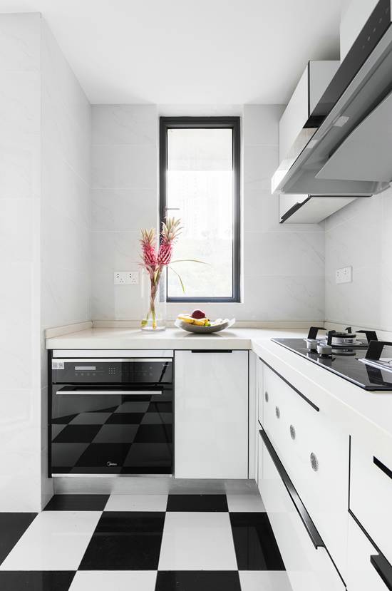 爵士白的墙砖与地面黑白方格相间,让整个空间不再呆板,充满活力。而且打理起来也特别的方便,嵌入式的灶台和烤箱、碗柜等,让空间变得更加宽敞和实用了。