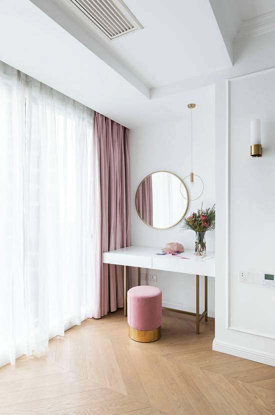 卧室靠窗的位置采光度非常好,日常化妆区域最适合的位置就在此处。圆形金属边框化妆镜,暖粉色水晶绒化妆椅,喜欢这样浪漫的小资情调,不仅颜值爆表,还充满了现在最流行的元素,设计师真的很懂我。